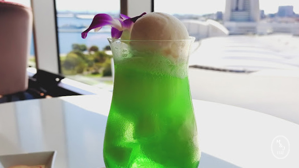 友達は、メロンクリームソーダを注文しました。以前の投稿でご紹介したカハラブルークリームソーダと同じく、ココナッツアイスクリームがトッピングされています。