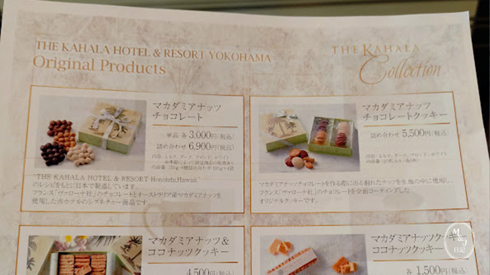 チェックインを待っている間に、ブティックの方が、購入できる商品のご案内を配布していました。